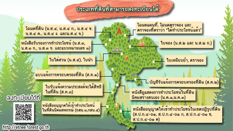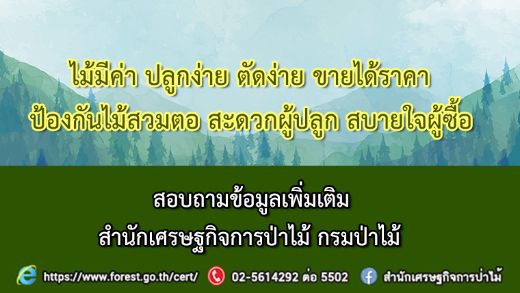 - ช่องทางการติดต่อเมื่อพบปัญหา การใช้งานระบบไม้มีค่าในที่ดินกรรมสิทธิ์ (e-Tree) โทรศัพท์ 1310 กด 3 หรือ 02-5614292 - 3 ต่อ 5502 และ 5621 โทรสาร 02-5799595